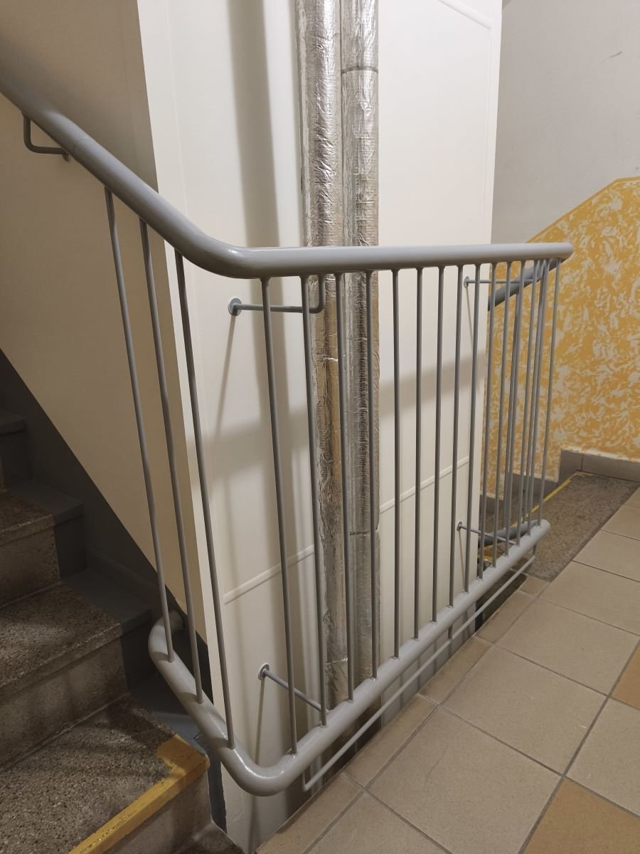 - Atypické řešení zábradlí kolem šachty, které muselo zohlednit vedení teplovodního potrubí v prostoru zrcadla schodiště